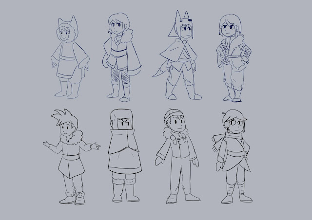 After a few more designs, we finally settled on the design on the right for its simplicity, with a sash tied around his waist to hint at his true form.